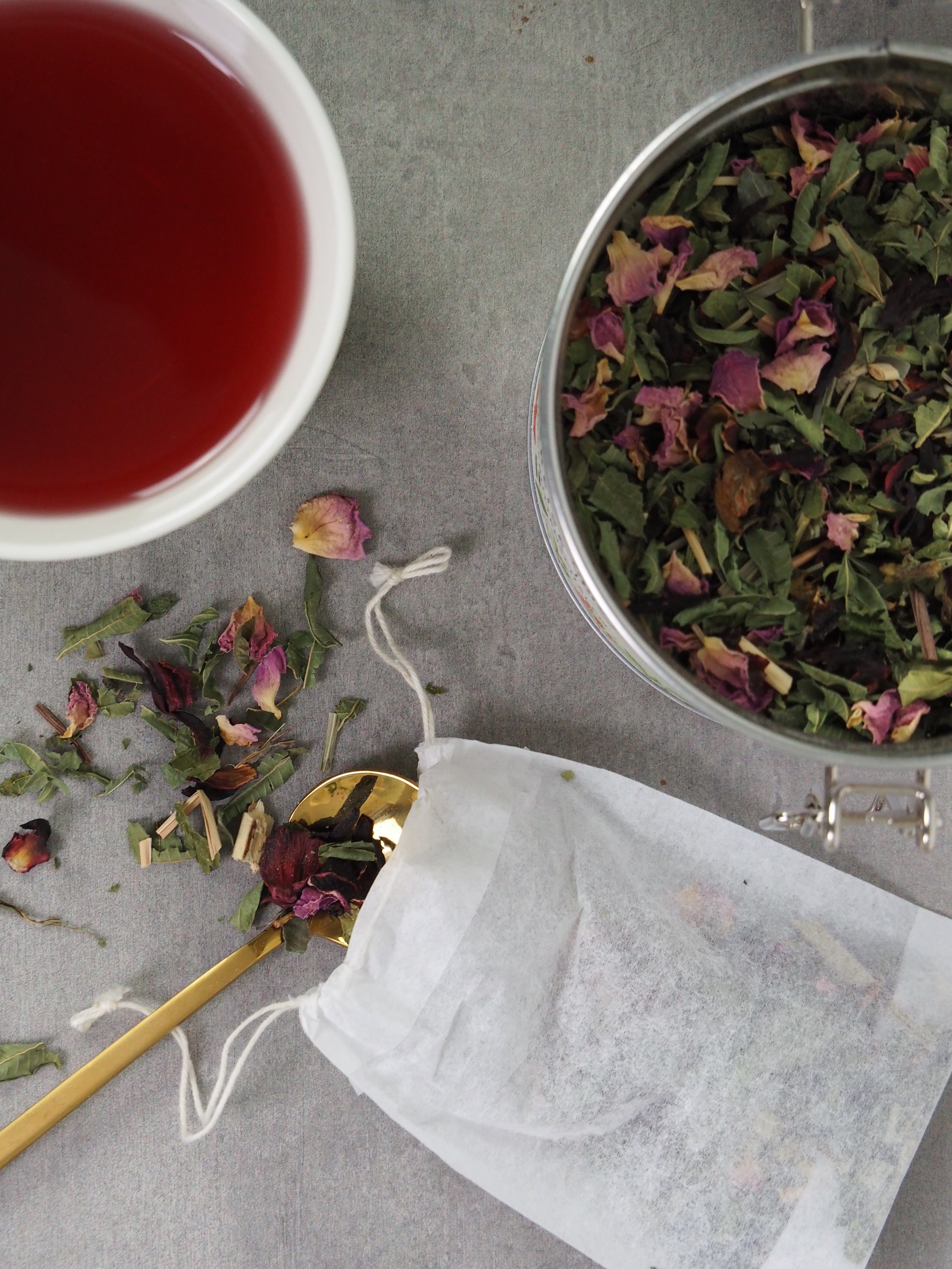 ZUTATEN: Hibiskusblüten, Hagebuttenschalen, Brennnessel, Lemongras, Zitronenverbene,